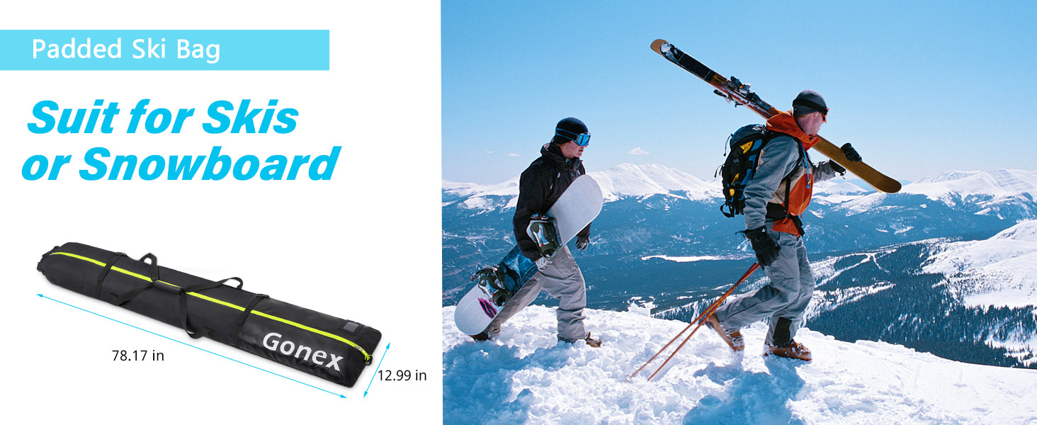 Die gepolsterte Skitasche von Gonex bietet Platz für ein einzelnes Paar Ski mit einer Länge von bis zu 200 cm. Möglicherweise ist nicht genügend Platz vorhanden, um mehrere Paar Ski sicher zu transportieren.