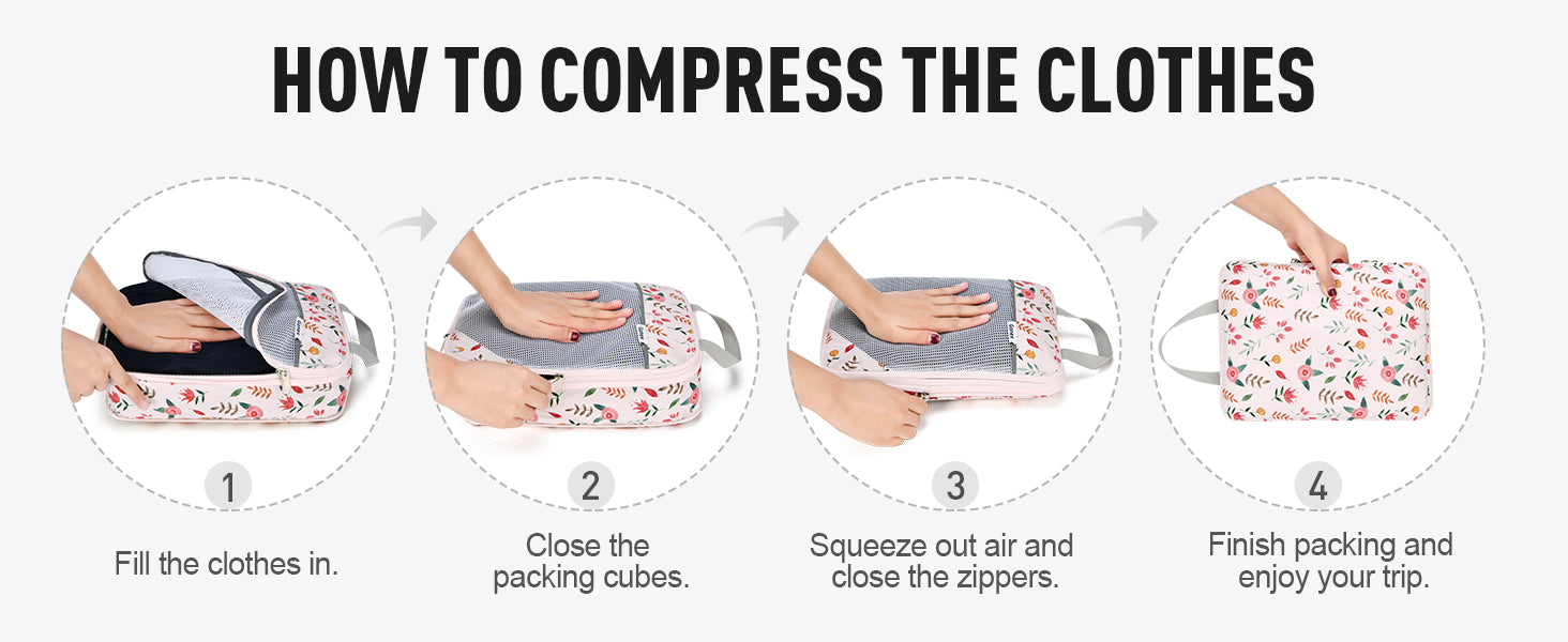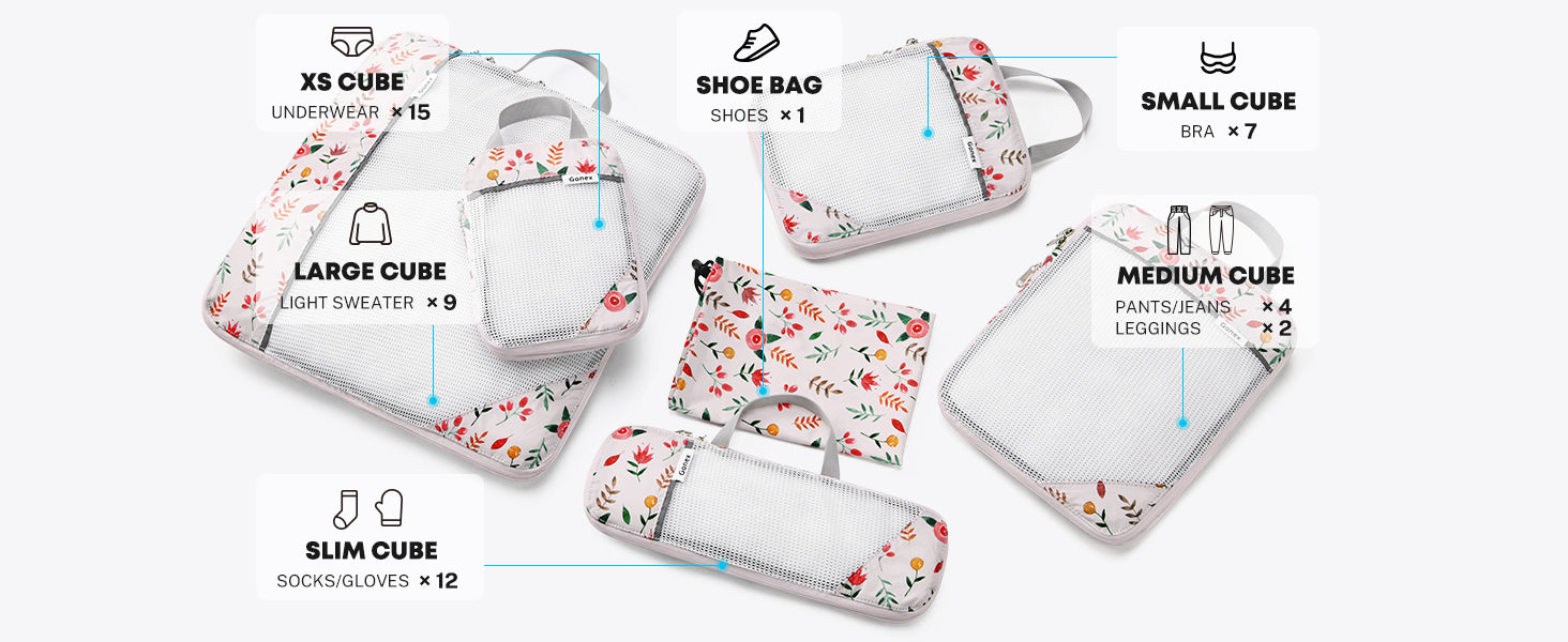 Ideales para cualquier ocasión, estos cubos de compresión para empacar son perfectos para mantener su equipaje organizado y ordenado. Son adecuados para vacaciones familiares, viajes de negocios, campamentos al aire libre y almacenamiento diario. Con su diseño elegante y duradero, ahora puede viajar con facilidad y estilo, sabiendo que sus pertenencias están bien organizadas y son de fácil acceso. Dígale adiós al exceso de equipaje y hola a viajar sin problemas con los cubos de compresión para empacar con motivos florales de Gonex.