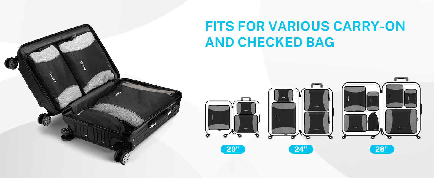 Simplifique el embalaje y desembalaje: haga que sus viajes sean más sencillos con los organizadores de equipaje Gonex. Guarde y organice su ropa sin esfuerzo, garantizando prendas sin arrugas durante todo su viaje. Deshacer el equipaje se convierte en algo muy sencillo con nuestros eficientes cubos de embalaje.