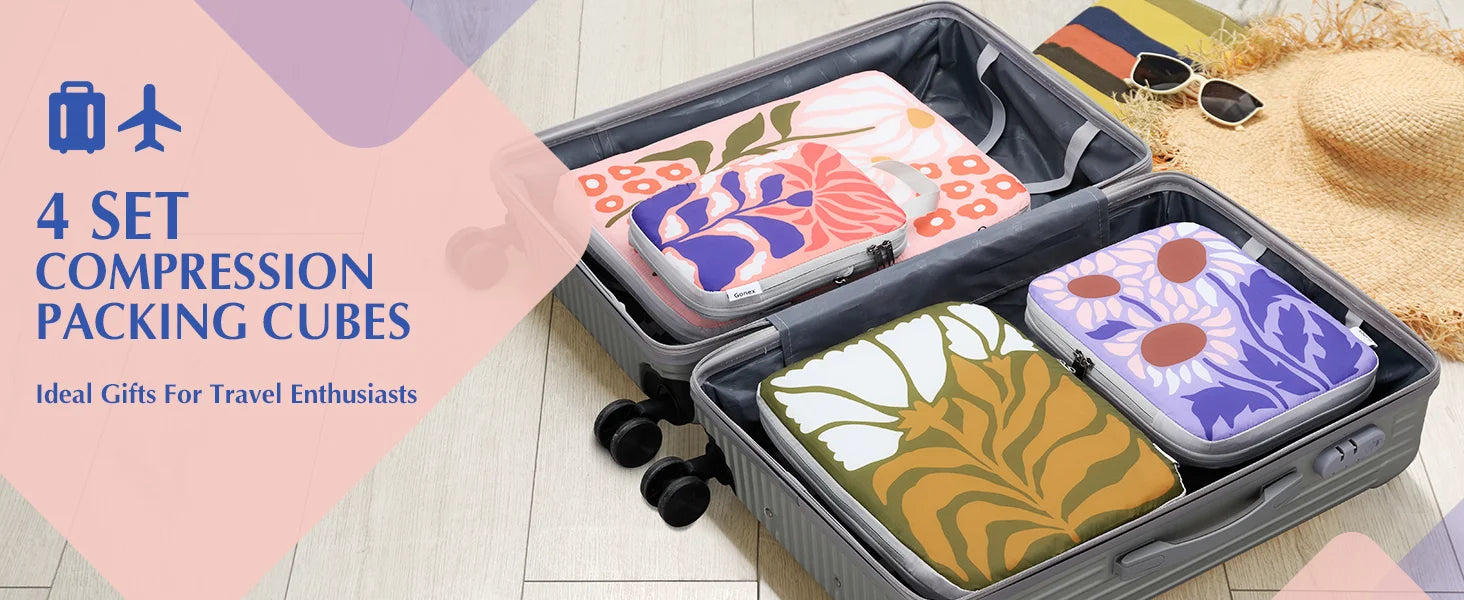 KEEP ITEMS NEAT & ORGANIZED: These compression packing cubes help you stay organized by neatly arranging your clothes. The modern botanical designs featuring stylized florals in sophisticated color palettes - including soft pink with daisies, olive green with leaves, lavender with sunflowers, and coral with purple accents - make it easy to identify each cube's contents.