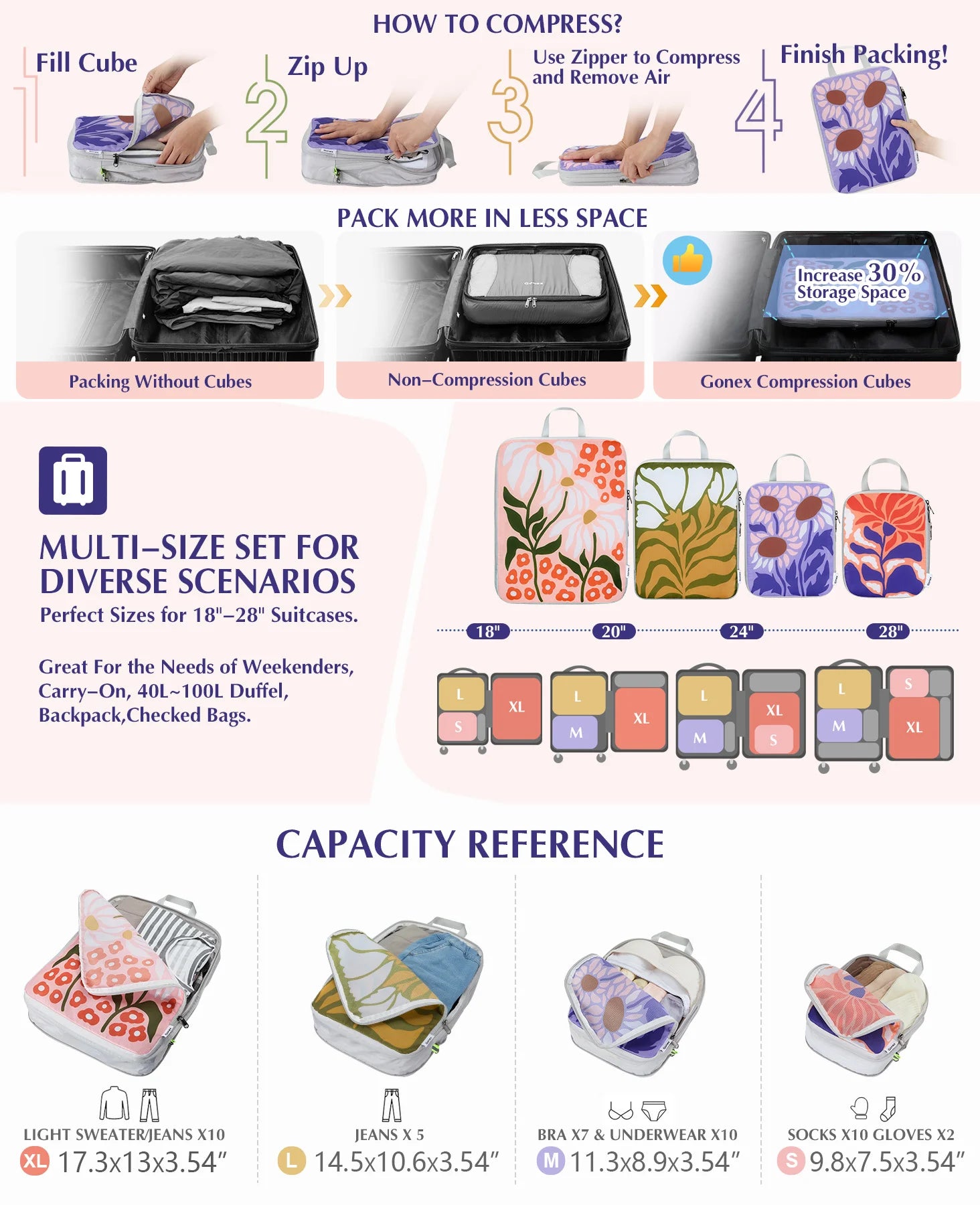 SPACE-SAVING PACKING CUBES: Gonex Compression Packing Cubes feature a compression zipper design that removes air, allowing you to save up to 30% more space in your suitcase.