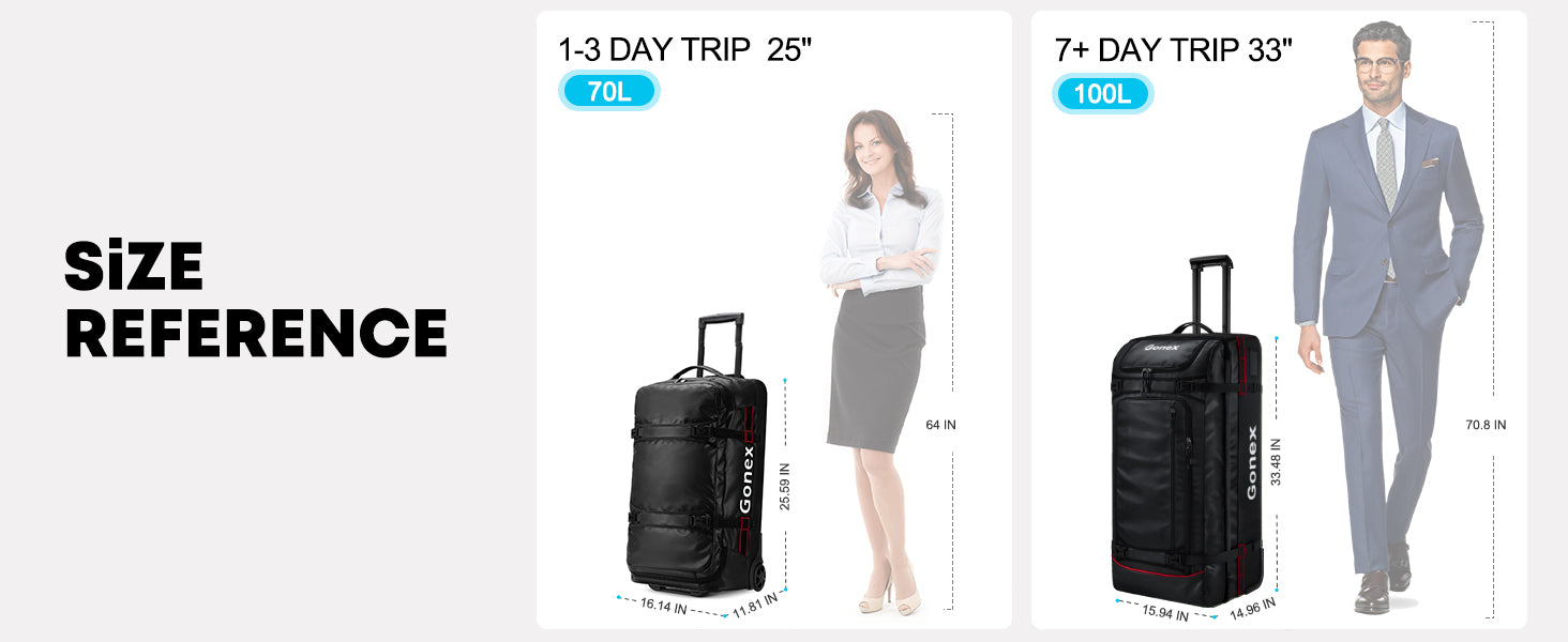Q1: What are the interior dimensions of the 70L and the 100L of the Gonex Rolling Duffle Bag with Wheels?