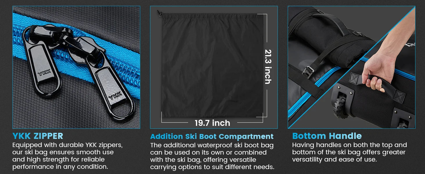- Travel smarter with premium YKK zippers providing quick access to your gear, while the included waterproof boot bag keeps your footwear separate and dry. The versatile strap system easily converts from shoulder carry to equipment transport, adapting to your changing needs on the mountain.