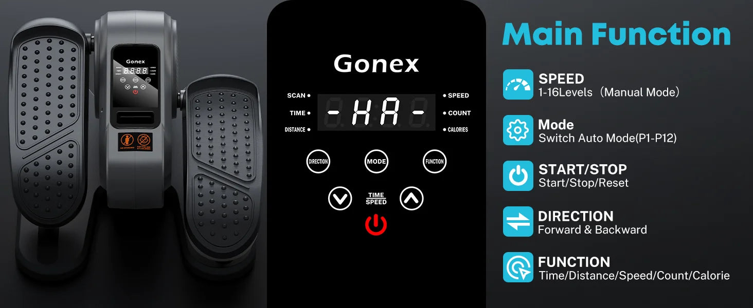 • Intelligent Fitness Technology: Embrace the future of personal fitness with the Gonex Elliptical's smart remote control and advanced LED digital monitor. Specially designed for user comfort, the remote allows effortless adjustments without physical strain, while the real-time digital display provides comprehensive workout insights, tracking essential metrics like time, distance, speed, repetition count, and calorie expenditure.