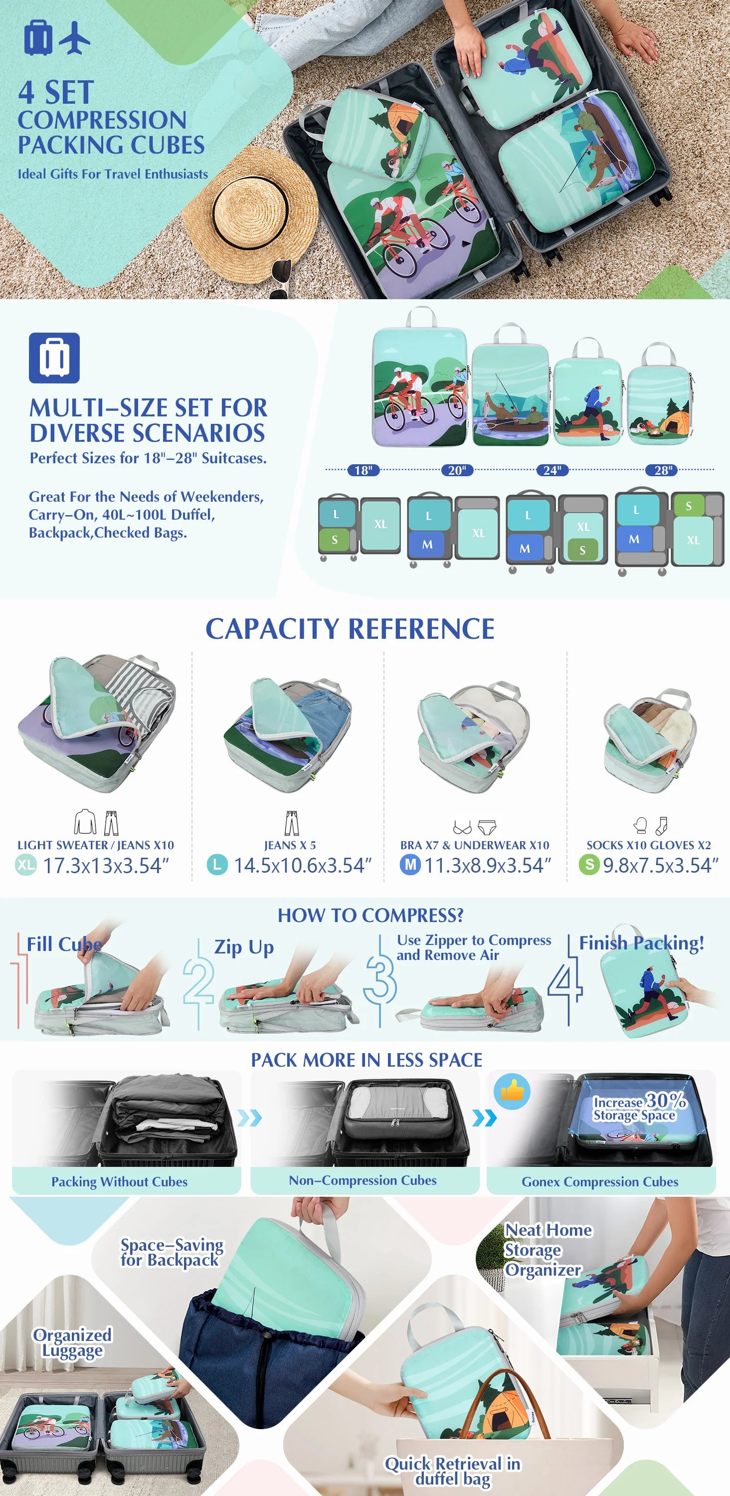 Outdoor Packing Cubes for Adventure Travels: Gonex Outdoor Packing Cubes feature a compression zipper design that removes air, allowing you to save up to 30% more space in your luggage.