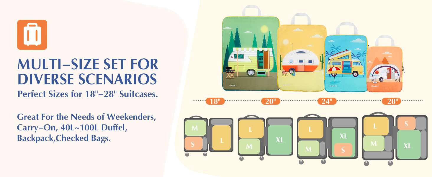 - KEEP ITEMS NEAT & ORGANIZED: These compression packing cubes help you stay organized by neatly arranging your clothes. These Gonex packing cubes feature delightful and colorful designs, each piece in the set showcasing a different RV illustration.