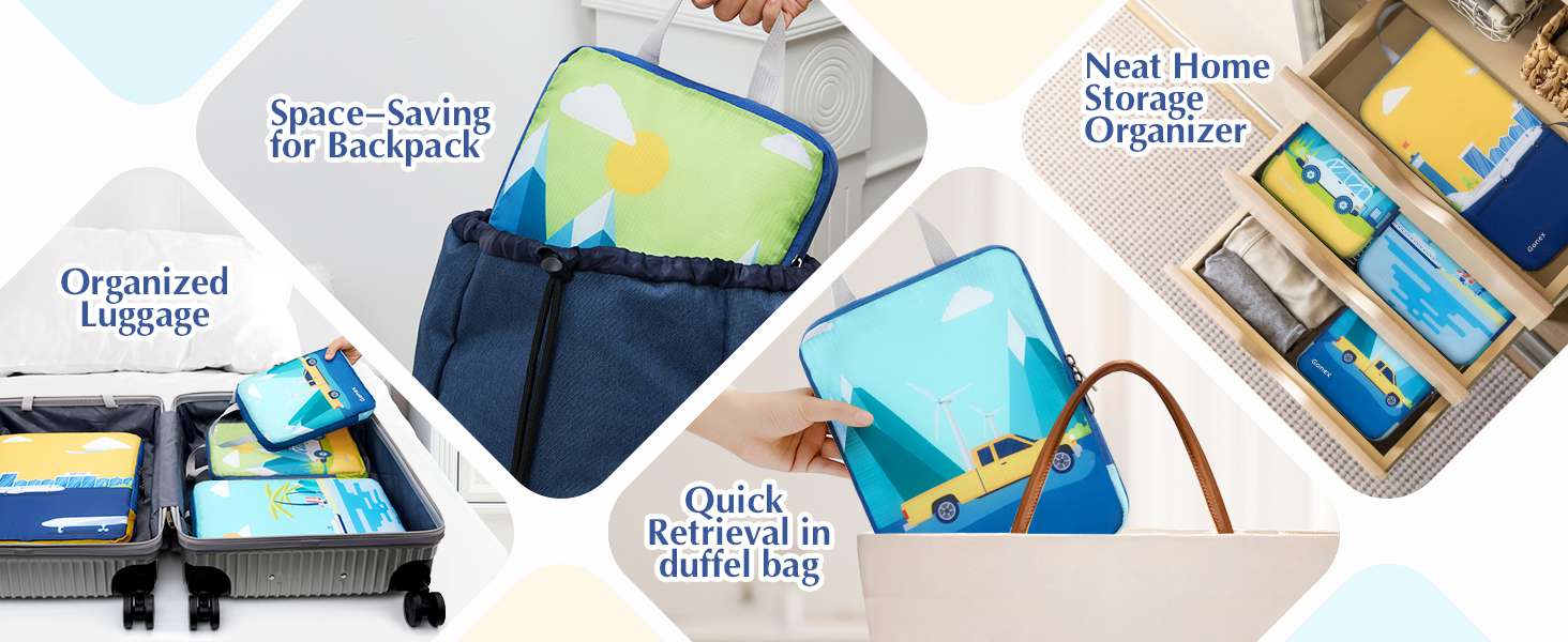 - Endless Travel Possibilities: These packing cubes are suitable for a wide range of occasions, from family trips and business travel to outdoor adventures and everyday storage. The fun, travel-inspired designs, featuring airport scenes, beach cruises, and road trip campers, add a touch of personality to your journey.